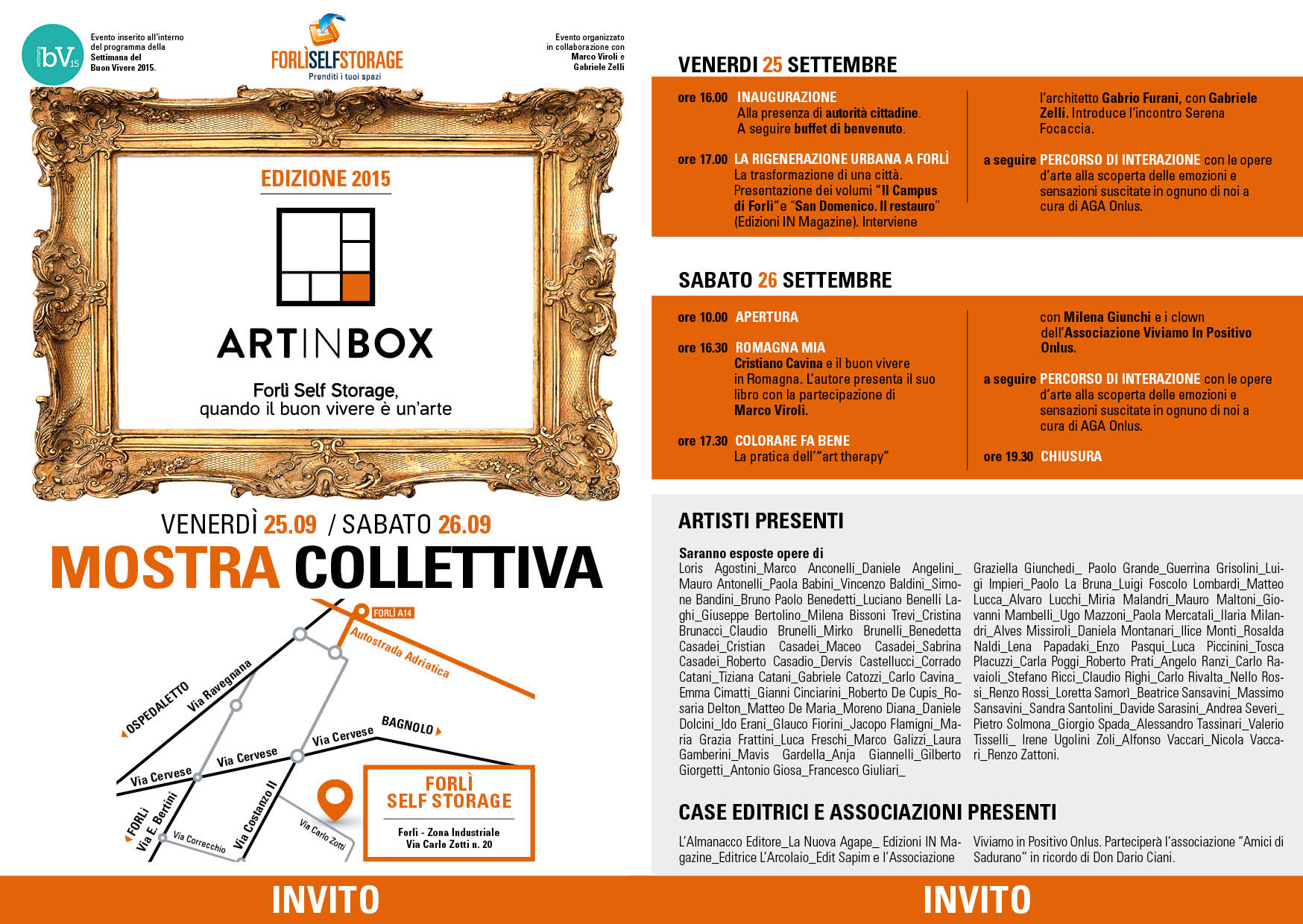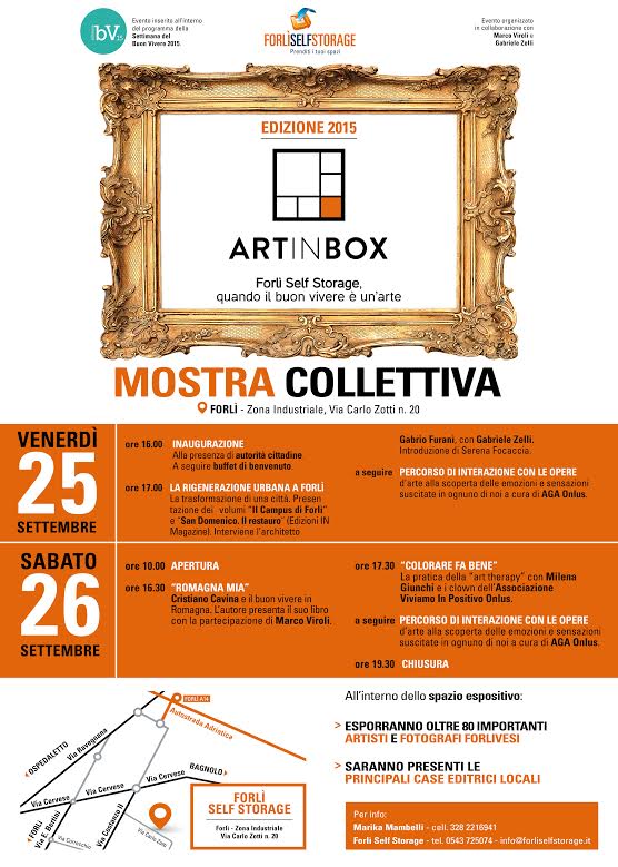 Sabato 26 settembre, arte e buon vivere si incontreranno per tutta la giornata con “Art in box”, la mostra collettiva che ospita oltre ottanta artisti e fotografi forlivesi e alcune delle principali case editrici del territorio. Dalle 10.00 alle 19.30 gli spazi di Self Storage saranno aperti per ammirare le opere d’arte, incontrare gli editori e i loro libri e assistere a presentazioni e momenti culturali. “Art in box” vuole dare l’opportunità ai cittadini di avvicinare le realtà artistiche e culturali forlivesi, visitando contemporaneamente gli spazi ampliati di Forlì Self Storage che ha aggiunto 100 nuovi box a disposizione dei clienti.